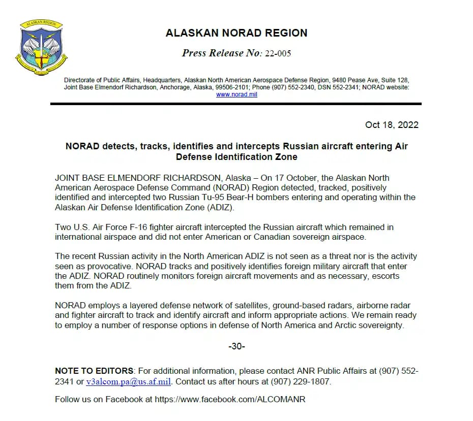 “NORAD tracks and positively identifies foreign military aircraft that enter the ADIZ,” and “routinely monitors foreign aircraft movements and as necessary, escorts them from the ADIZ,” the statement said.
