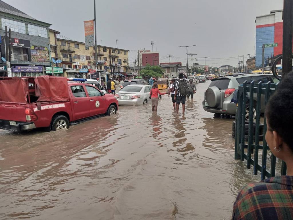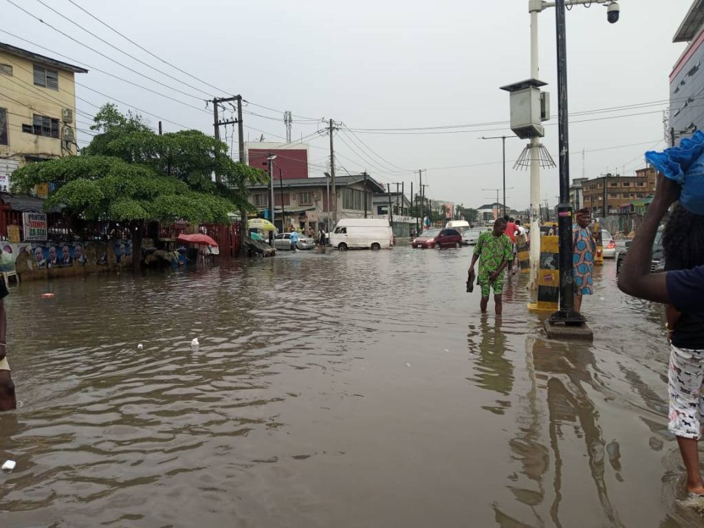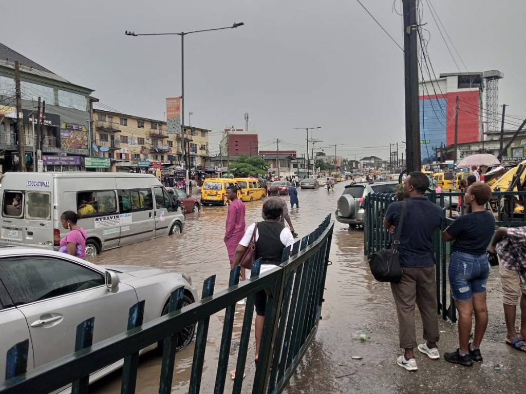 PHOTOS: Commuters stranded as flood takes over Obafemi Awolowo way in Ikeja, Lagos