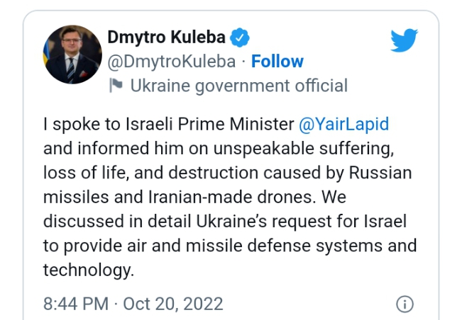 Ukraine’s Foreign Minister Dmytro Kuleba said he has spoken to Israel’s Prime Minister Yair Lapid to tell him about the “unspeakable suffering” caused by Russian missiles and Iranian-made drones.