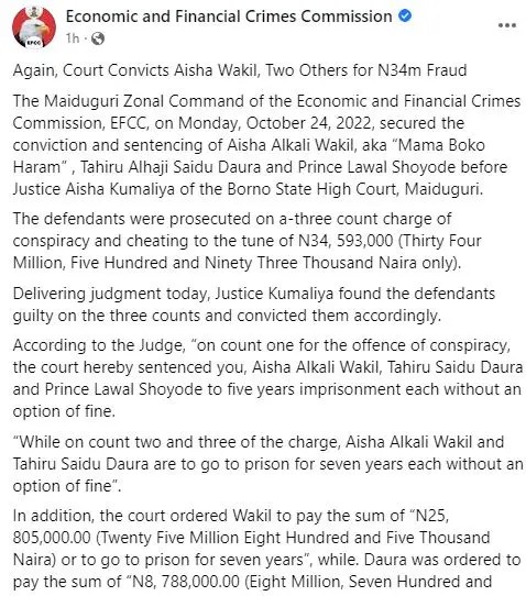 The Maiduguri Zonal Command of the Economic and Financial Crimes Commission, EFCC, on Monday, October 24, 2022, secured the conviction and sentencing of Aisha Alkali Wakil, aka “Mama Boko Haram” , Tahiru Alhaji Saidu Daura and Prince Lawal Shoyode before Justice Aisha Kumaliya of the Borno State High Court, Maiduguri.