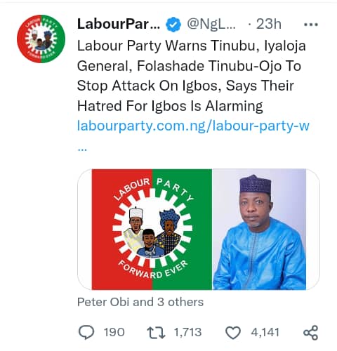 The Labour Party, LP, has warned in strong time the Iyaloja General Chief Mrs Folashade Tinubu-Ojo and the Lagos Governor Babajide Sanwo-Olu over attempt to frustrate residents of Lagos from voting candidates of their choice as the nation approaches the next General Elections.