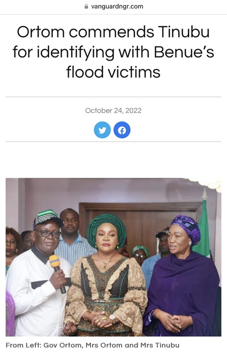 Governor Samuel Ortom of Benue state has commended the wife of the All Progressives Congress, APC, Presidential candidate, Senator Oluremi Tinubu for identifying with the victims of flood disaster in the state.