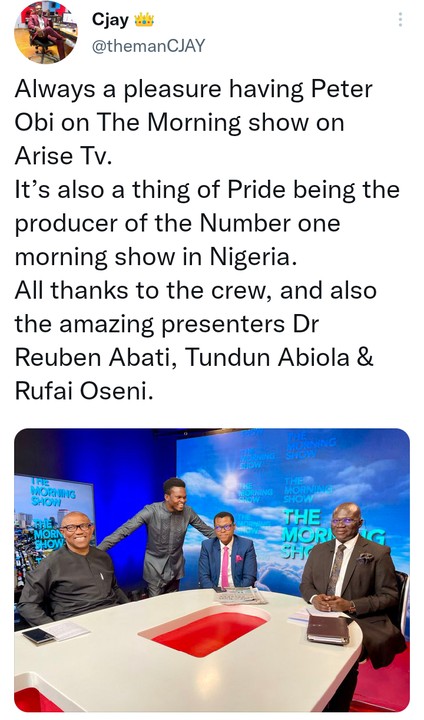 Always a pleasure having Peter Obi on the morning show on Arise TV.