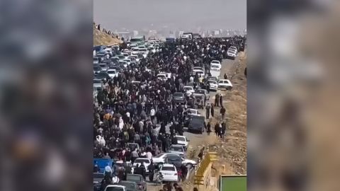 In videos shared on social media, large crowds of people and lines of cars are seen making their way to Saqqez’s Aichi cemetery where Amini is buried. Groups of people in the videos are heard chanting “women, life, freedom” and “death to this child-killing regime.”