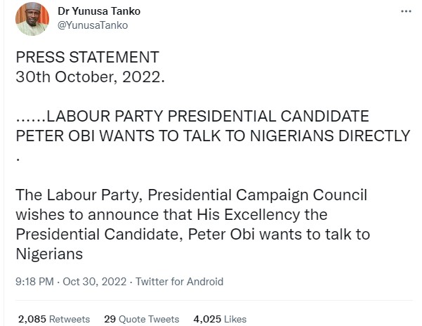 The Labour Party, Presidential Campaign Council wishes to announce that His Excellency the Presidential Candidate, Peter Obi wants to talk to Nigerians directly.