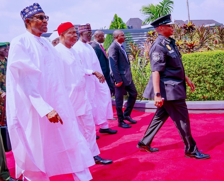 President Buhari with L-R: Yobe State Governor Mai Mala Buni, Imo State Governor Hope Uzodinma and IG of Police Usman Alkali Baba as he declared Open Senior Police Officer’s Retreat in Imo State on 31st Oct 2022