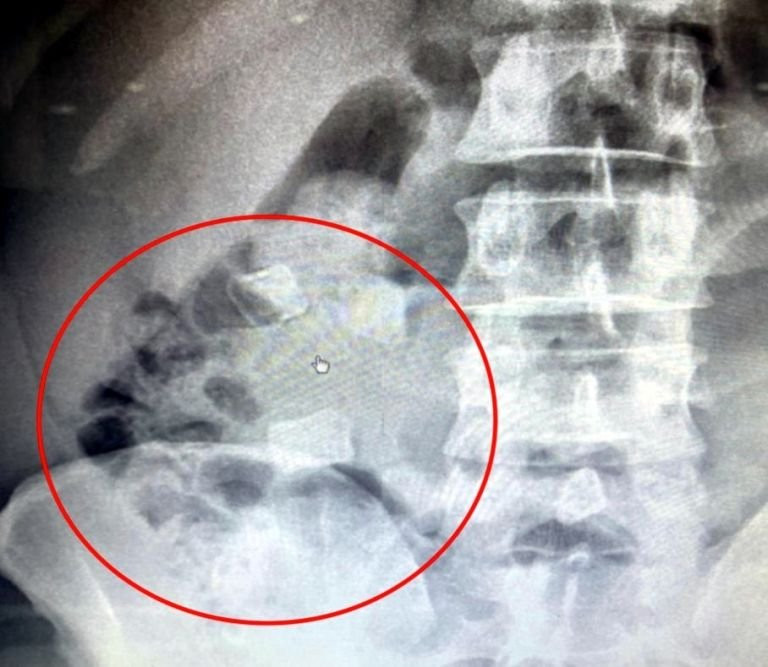 He was arrested and no drugs were found but an xray at the Police Hospital revealed seven plastic packages in his stomach.