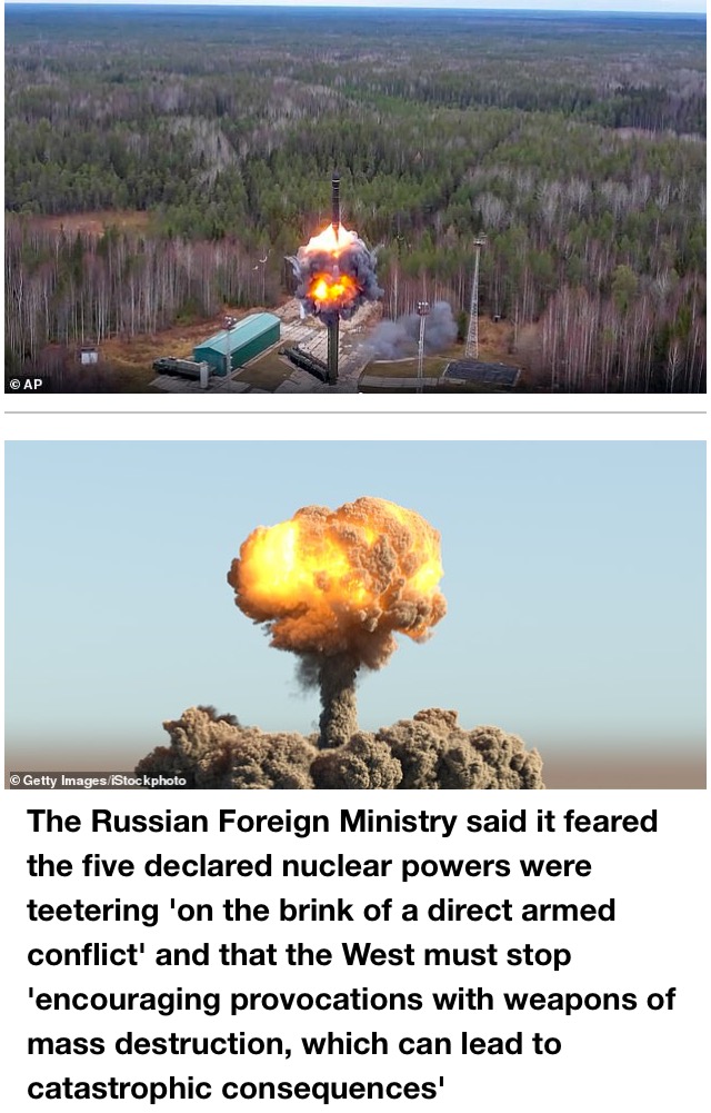 The Russian Foreign Ministry said it feared the five declared nuclear powers were teetering ‘on the brink of a direct armed conflict’ and that the West must stop ‘encouraging provocations with weapons of mass destruction, which can lead to catastrophic consequences’.