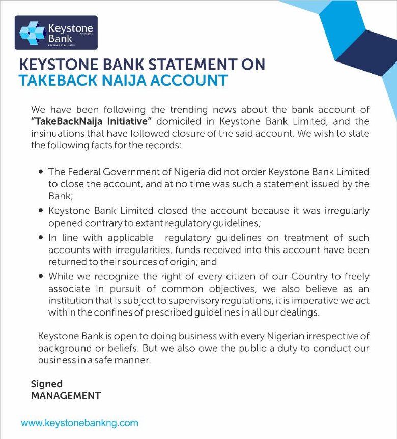 Keystone Bank says FG did not order it to close ‘TakeBackNaija’ account