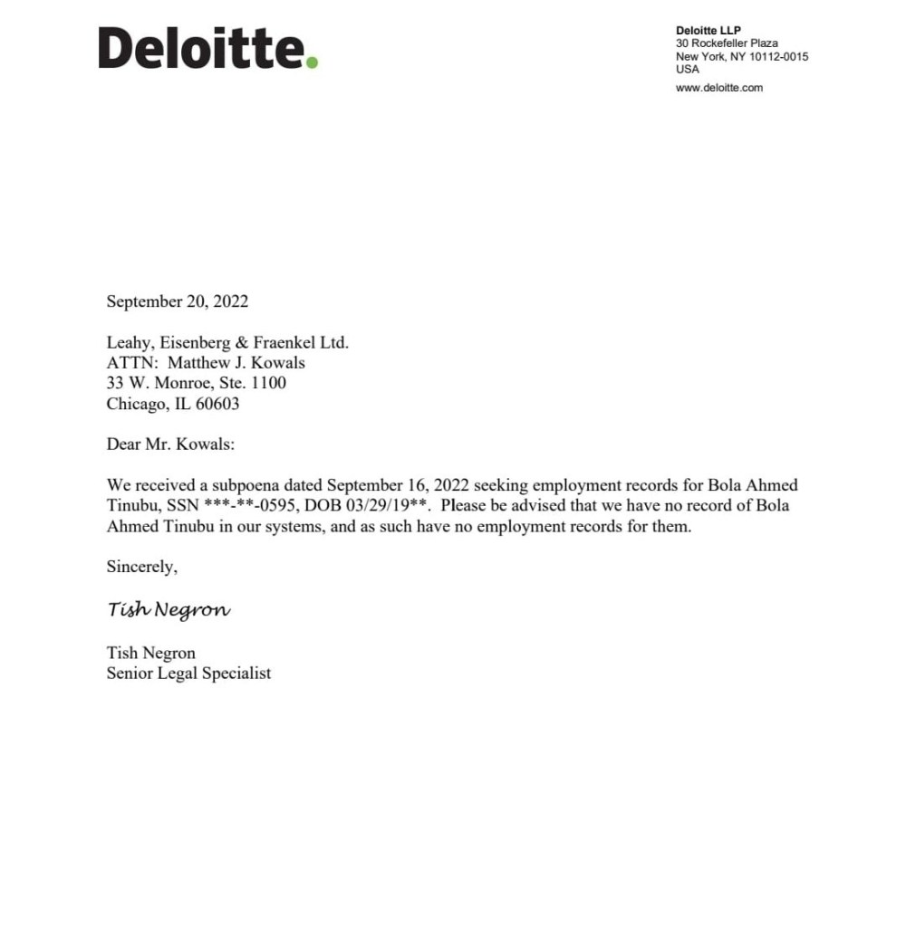 Deloitte USA has responded to subpoena ordering it to make available Tinubus Bonus history with the organization ( remember Tinubu said he earned 1.8 million dollars from in bonuses from Deloitte… Deloitte has denied knowledge of any Bola Tinubu ever working for them.