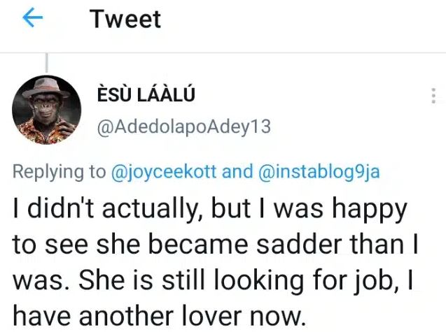 The Twitter user identified as Adedolapoadey13 said he tricked her into resigning from her job after discovering her cheating escapades.