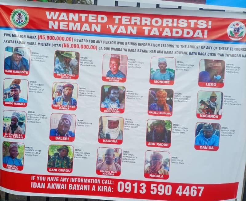 The Nigerian Military authorities has declared 19 Terrorists wanted and placed N5m bounty on each of them for anyone with information leading to their arrest. According to a banner placed along strategic locations across the country, a N5m reward awaits anyone with information that could lead to the arrest of any of the terrorists. TheContinue reading “Defence HQs Declares 19 Terrorists Wanted, Places ₦5m Bounty On Each”