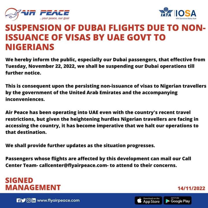 Air Peace has suspended flights to Dubai, United Arab Emirates (UAE), over the non-issuance of visas to Nigerians. Daily Trust had reported how the UAE authorities placed a visa ban on Nigerians three weeks ago. Emirates, the UAE carrier, had earlier suspended its flights, citing the inability to repatriate ticket funds in addition to theContinue reading “Air Peace Suspends Dubai Flights Over Visa Ban On Nigerians”