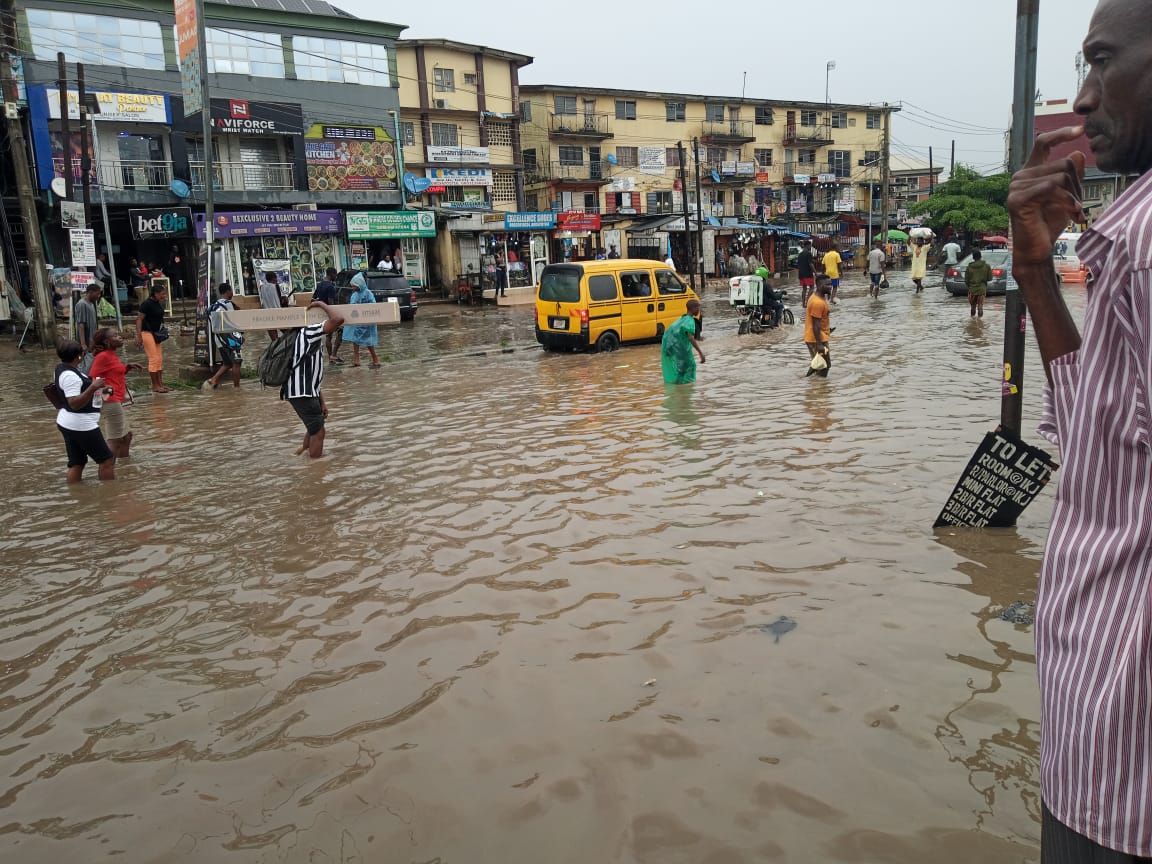 PHOTOS: Commuters stranded as flood takes over Obafemi Awolowo way in Ikeja, Lagos #ComputerVillage