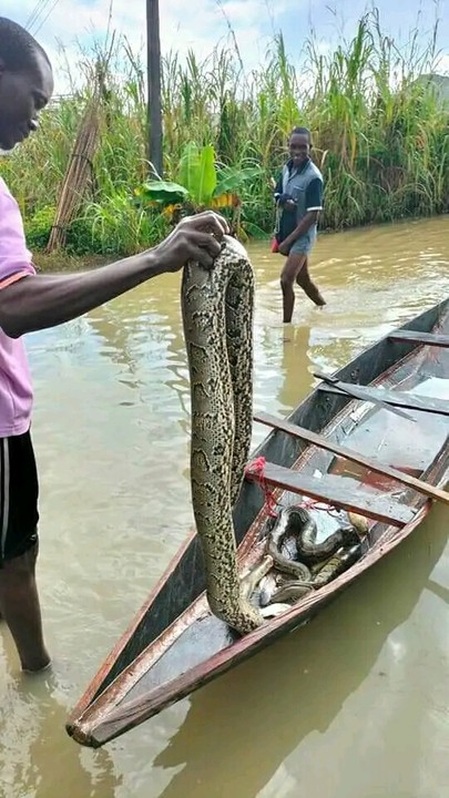 A fearless lady in Sagbama, Bayelsa State single handedly killed two pythons this morning while searching her fishing net in the floodwater.