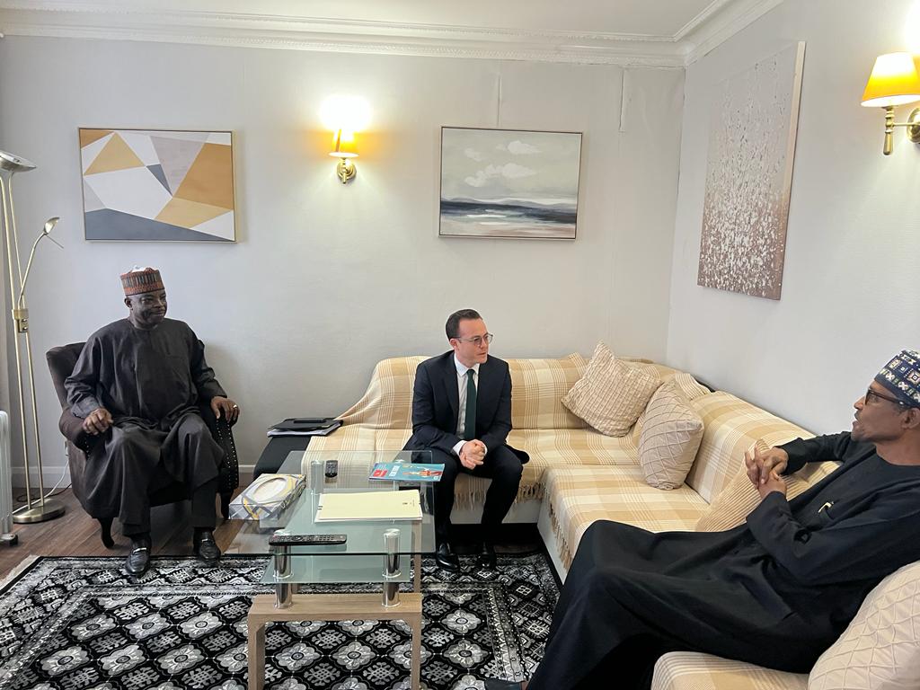 President Muhammadu Buhari receives Morocco’s Ambassador to the UK, Hakim Hajoui, who came to deliver a personal message from His Majesty King Mohammed VI of Morocco. With them is Nigerian High Commissioner to the UK, Sarafa Tunji Isola. London, Sunday, November 6, 2022